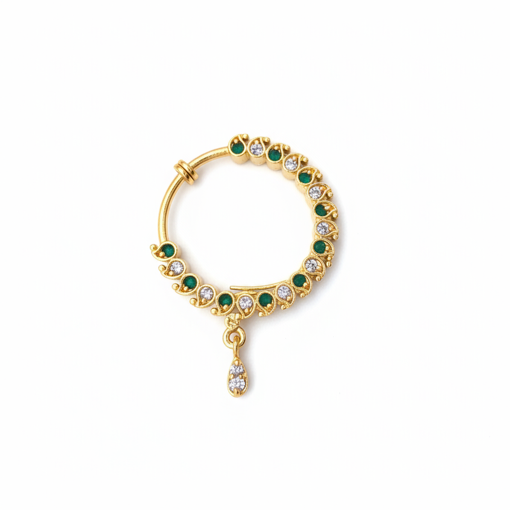 Experience the beauty of traditional temple jewelry without the commitment of piercing. This exquisite left-side nose ring features premium 24K gold plating and intricate gemstone detailing, designed to clip comfortably onto your nose.