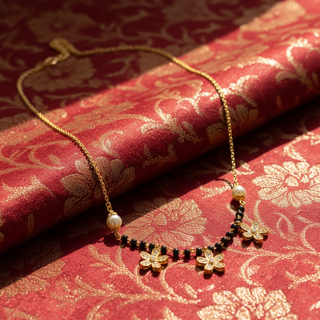 Exquisite 925 sterling silver necklace with gold plating, featuring delicate floral charms adorned with black beads and lustrous pearl accents. This elegant temple jewelry piece combines traditional craftsmanship with contemporary design, perfect for ceremonial occasions and special celebrations.