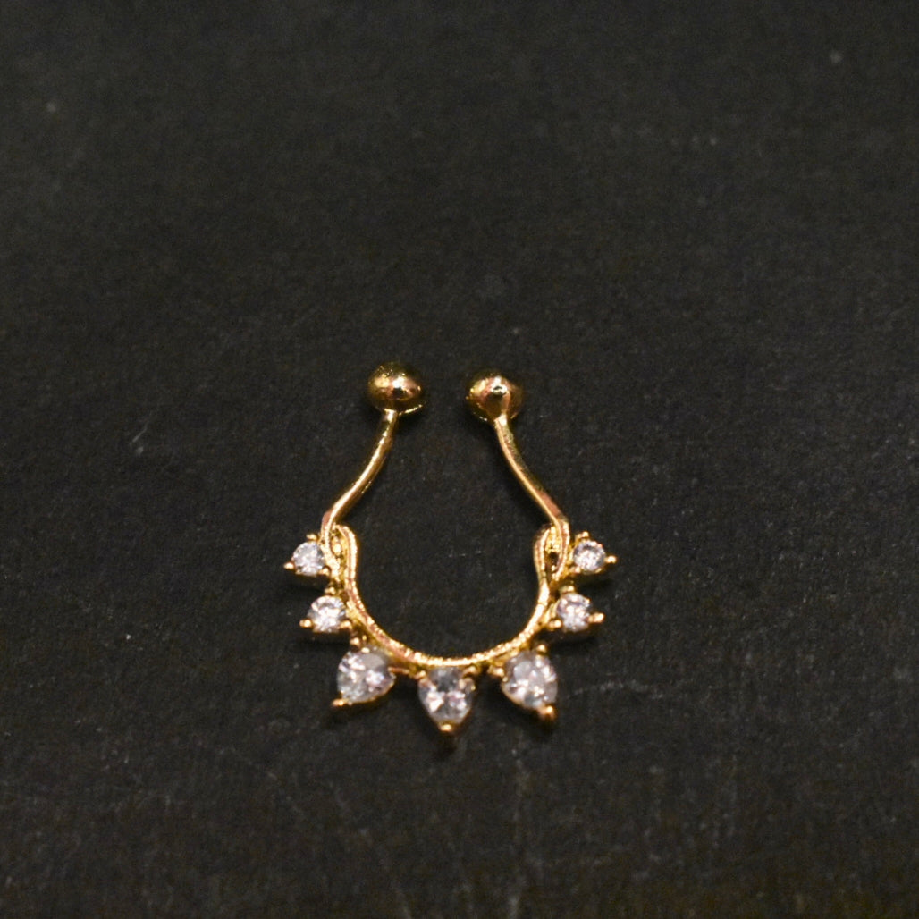 Adorn yourself with timeless elegance through this stunning 925 sterling silver septum nose pin featuring beautifully arranged pear-shaped cubic zirconia stones in a graceful fan design. The luxurious 24K gold plating adds warmth and radiance to this exquisite piece.