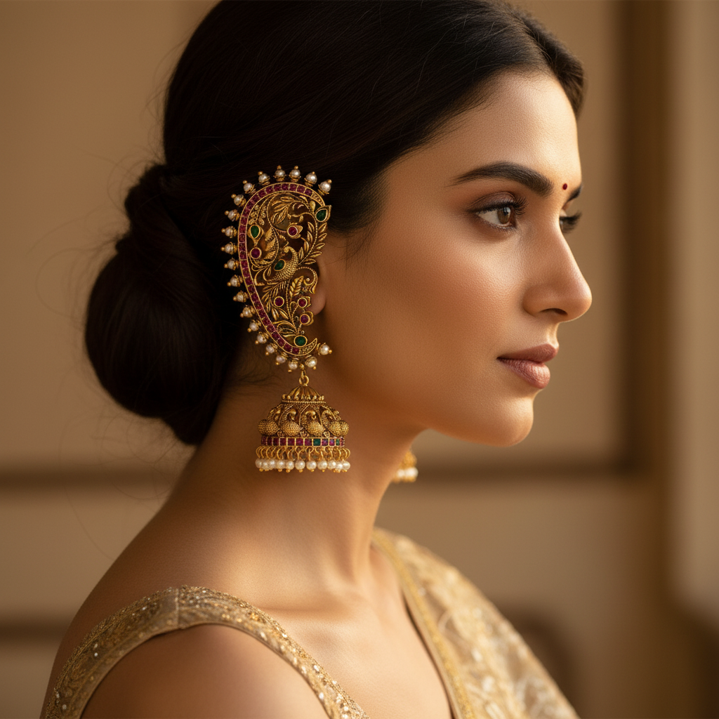 Experience the timeless beauty of traditional South Indian temple jewelry with these stunning peacock motif ear cuff earrings. Crafted with intricate filigree work, these statement pieces showcase authentic craftsmanship and heirloom aesthetics.