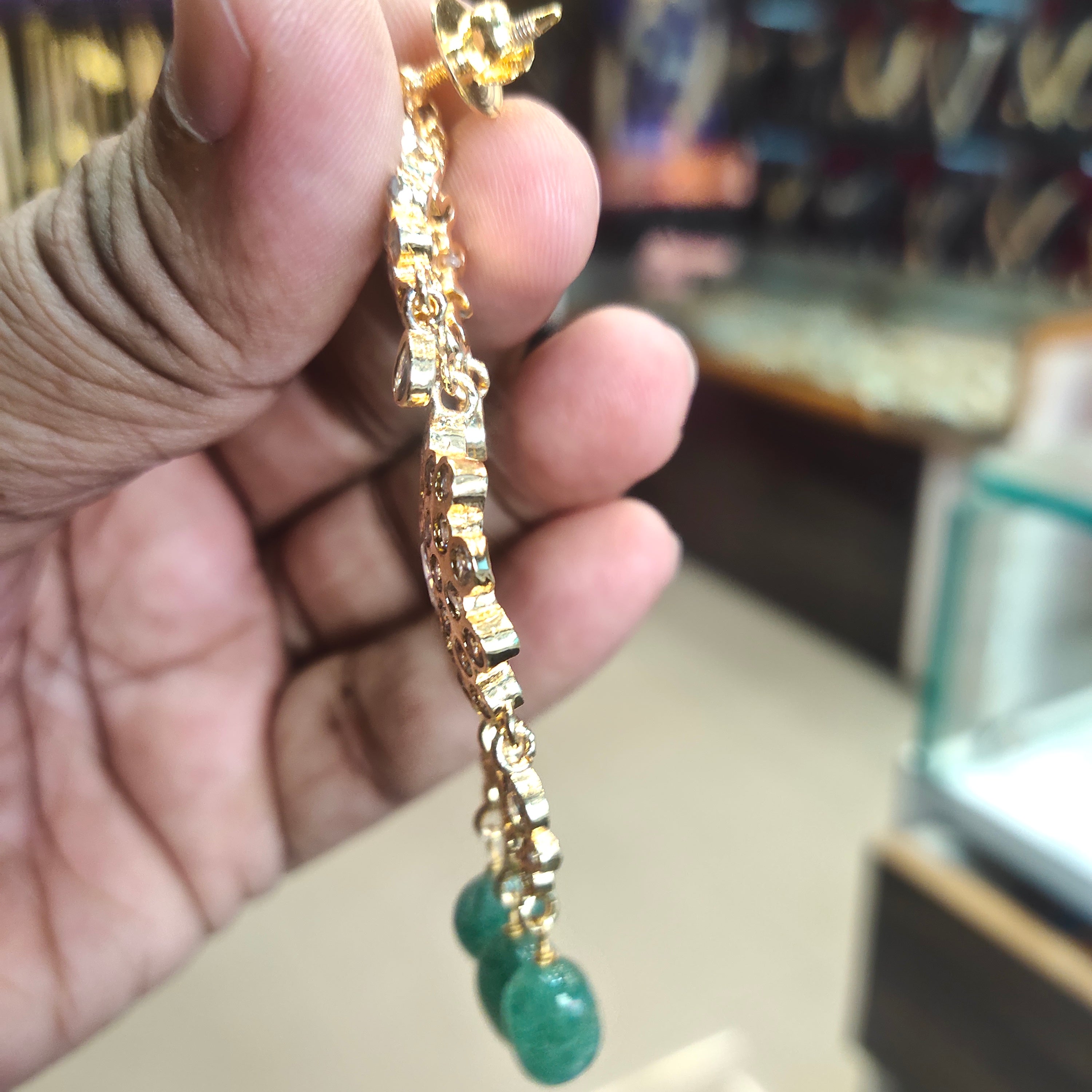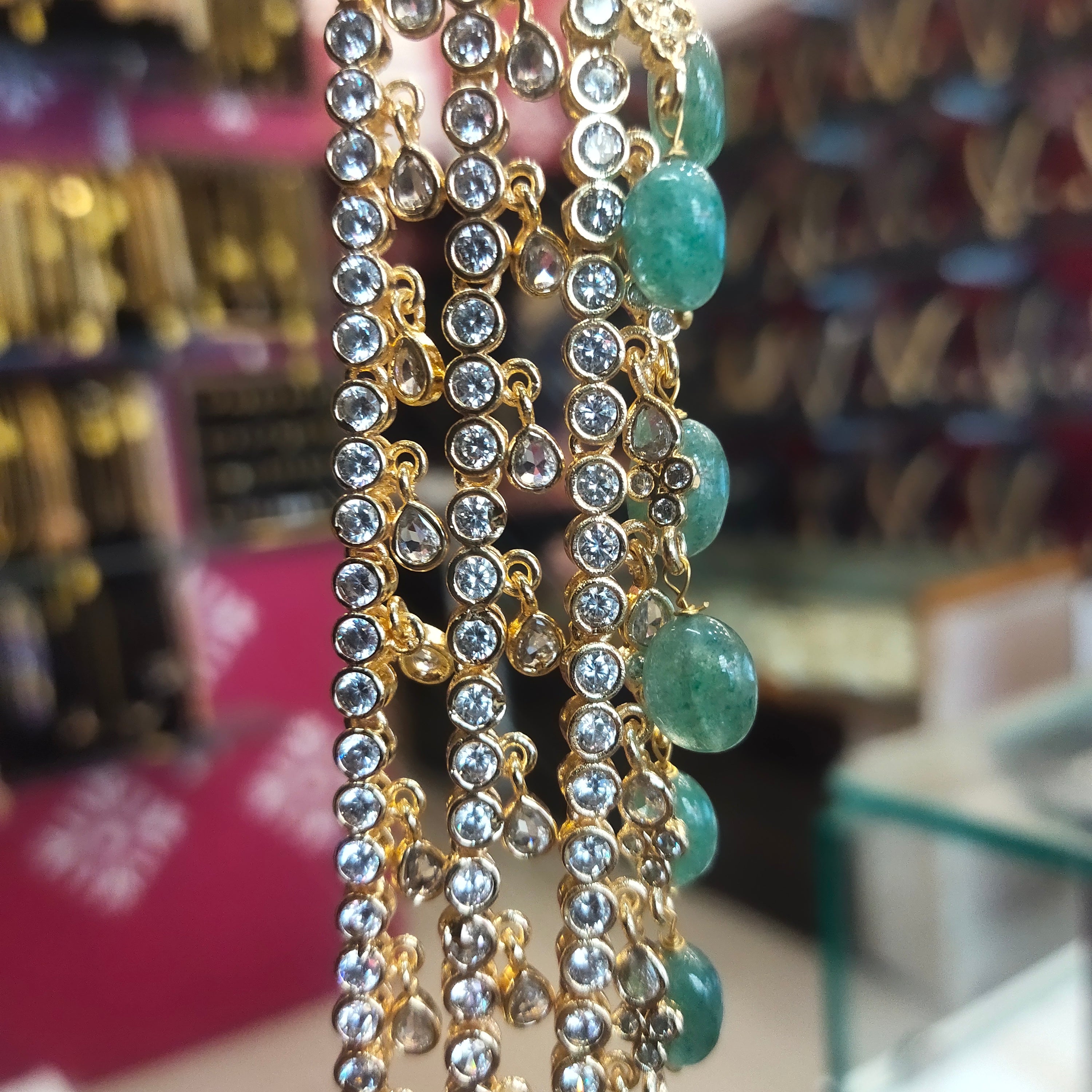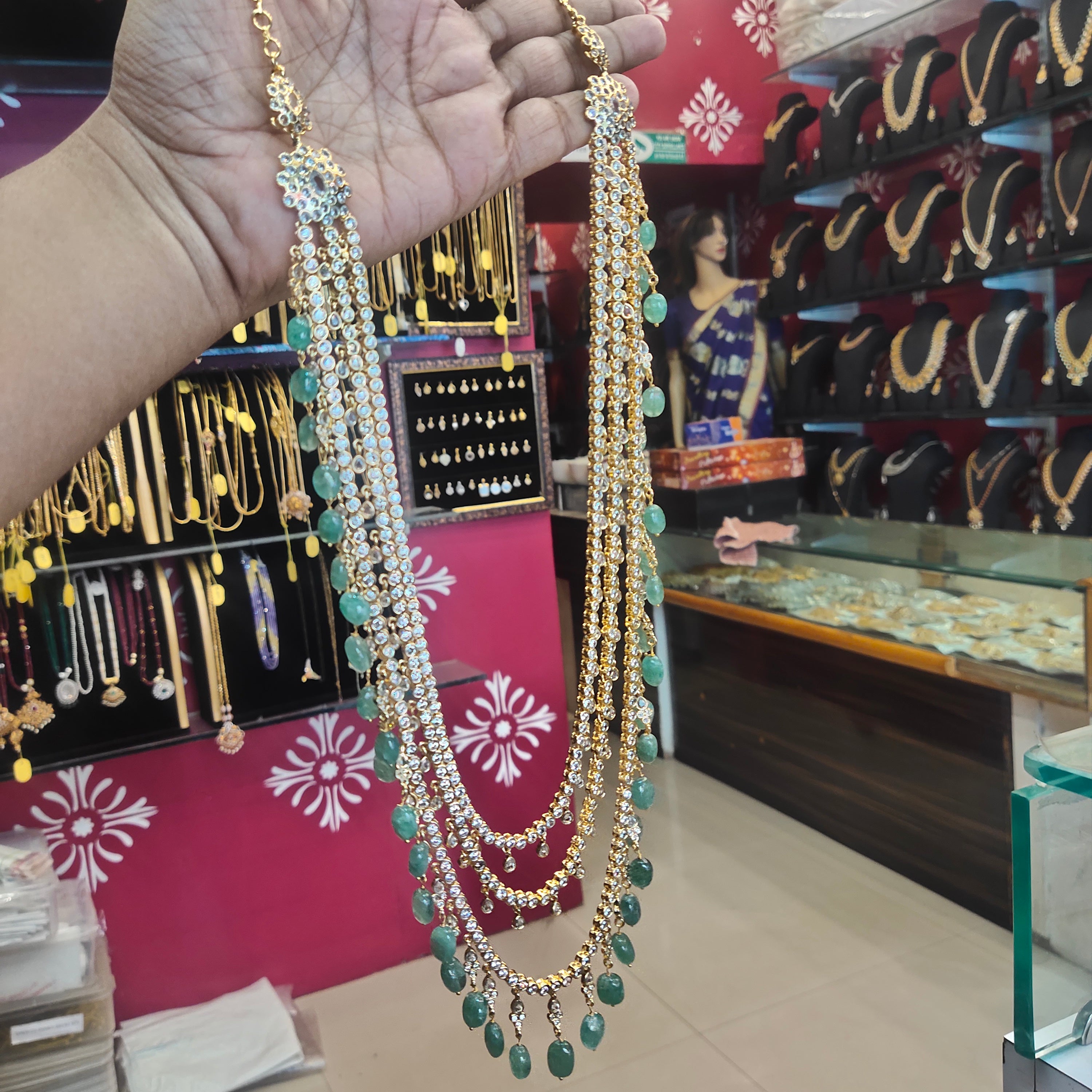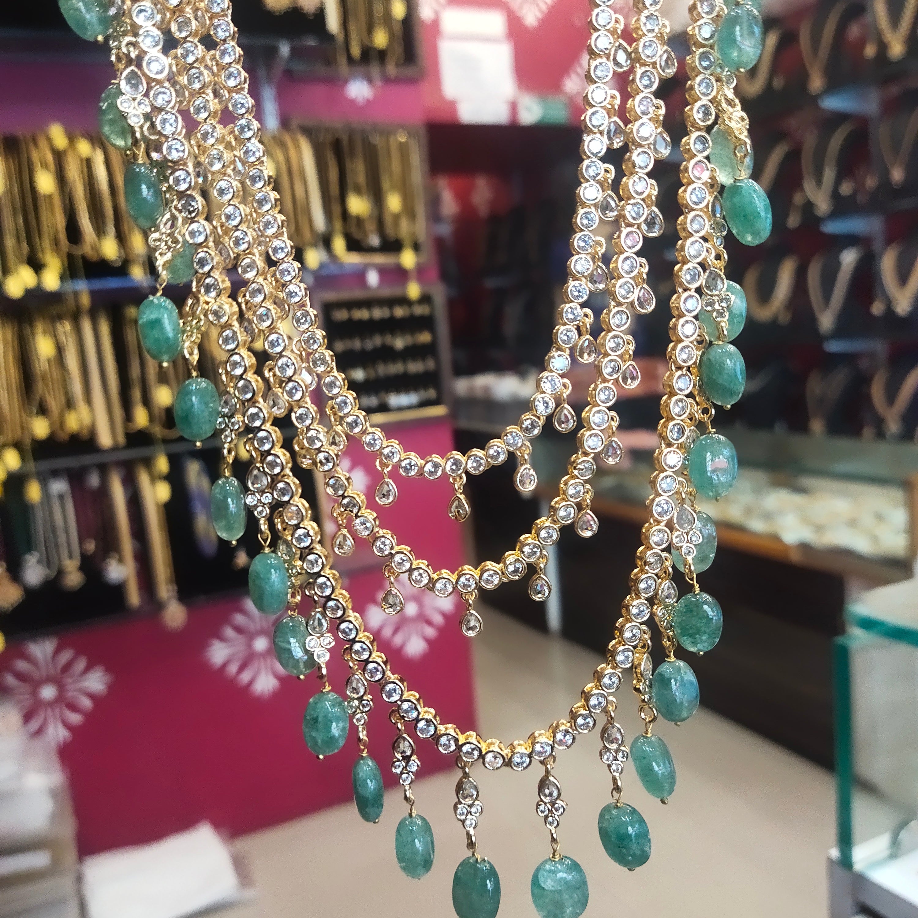The Asp Gold-Finished 3-Layered Zircon Long Necklace Set is a timeless and exquisite piece of jewelry that will add a touch of glamour to any bridal ensemble. The necklace features three layers of gorgeous royal emerald beads, which are complemented by shimmering zircon stones that add a touch of sparkle and sophistication.