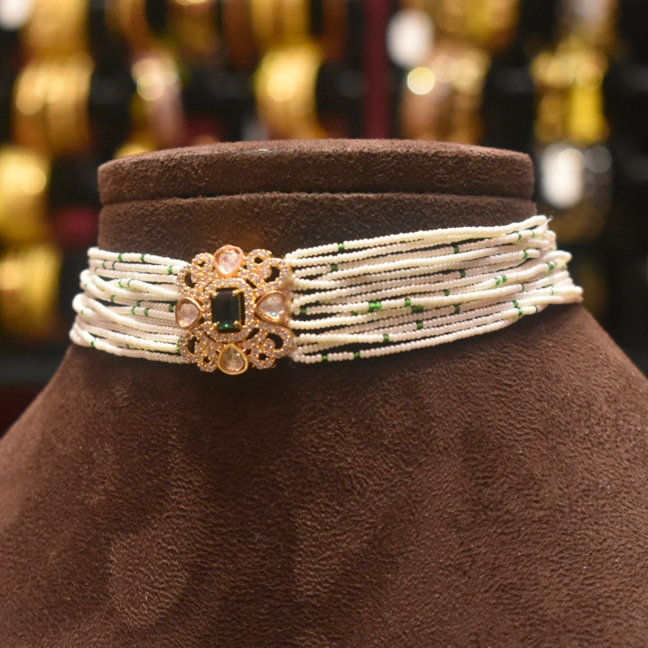 Asp Green Kundan Beaded Gold Plated Choker Necklace Set