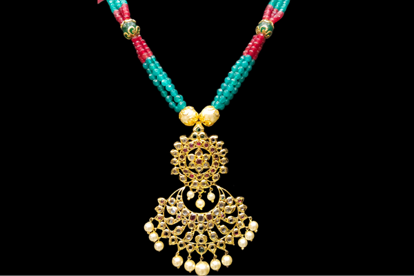 Multistrand ruby Emralds beads necklace with pendant studded with ruby, uncut American DiamondsĀ