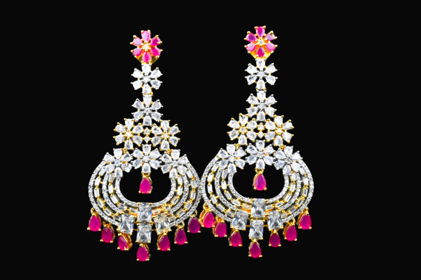 This captivating pair of majestic, glittering simulated American diamond & created Ruby emerald earrings set in High Quality Metal evoke exotic royal elegance and charm. A perfect pair for your special occasion to compliment your outfit.