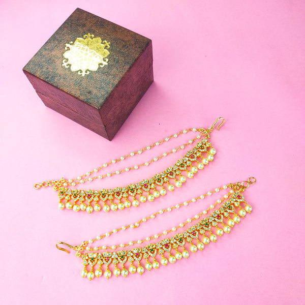 Derived from everlasting flowers, this gold-plated ear chain is specially crafted with sparkling CZ stones and lustrous pearls. A must-have accessory that adds elegance and sophistication to any traditional outfit.