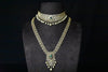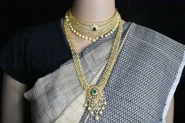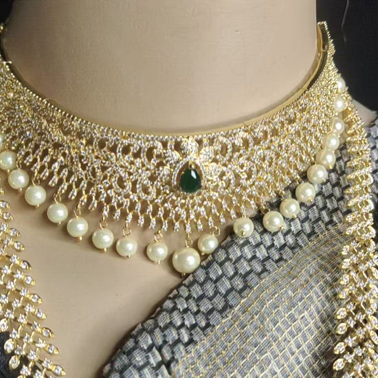 Dial-up the bridal vibe with this scintillating CZ mini bridal set. The long haar with its elaborate design exudes brilliance and grandeur - all what you need for a wedding. The choker set doubles the beauty of the whole set when combined with matching earrings.