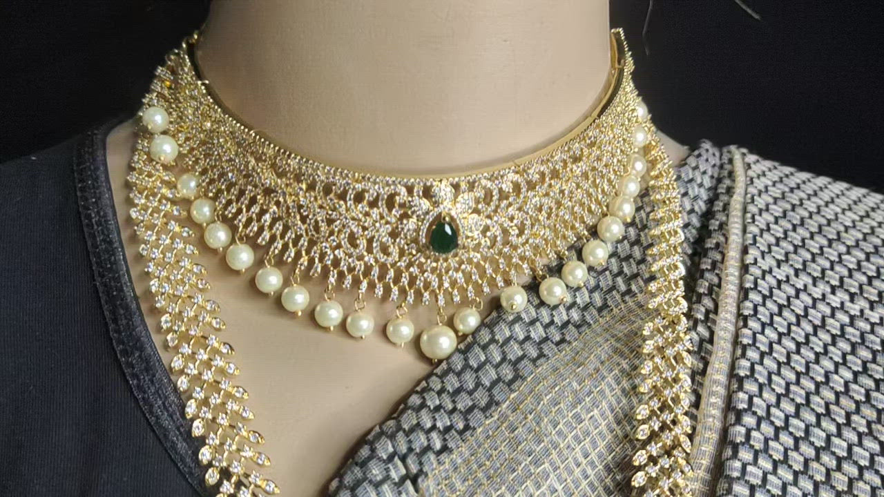 Dial-up the bridal vibe with this scintillating CZ mini bridal set. The long haar with its elaborate design exudes brilliance and grandeur - all what you need for a wedding. The choker set doubles the beauty of the whole set when combined with matching earrings.