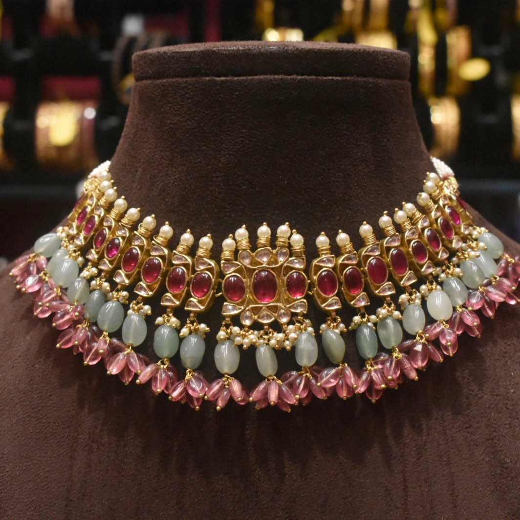 Embrace the timeless elegance of traditional Indian craftsmanship with this stunning pachi kundan necklace set. Each piece is meticulously handcrafted using authentic kundan setting techniques.