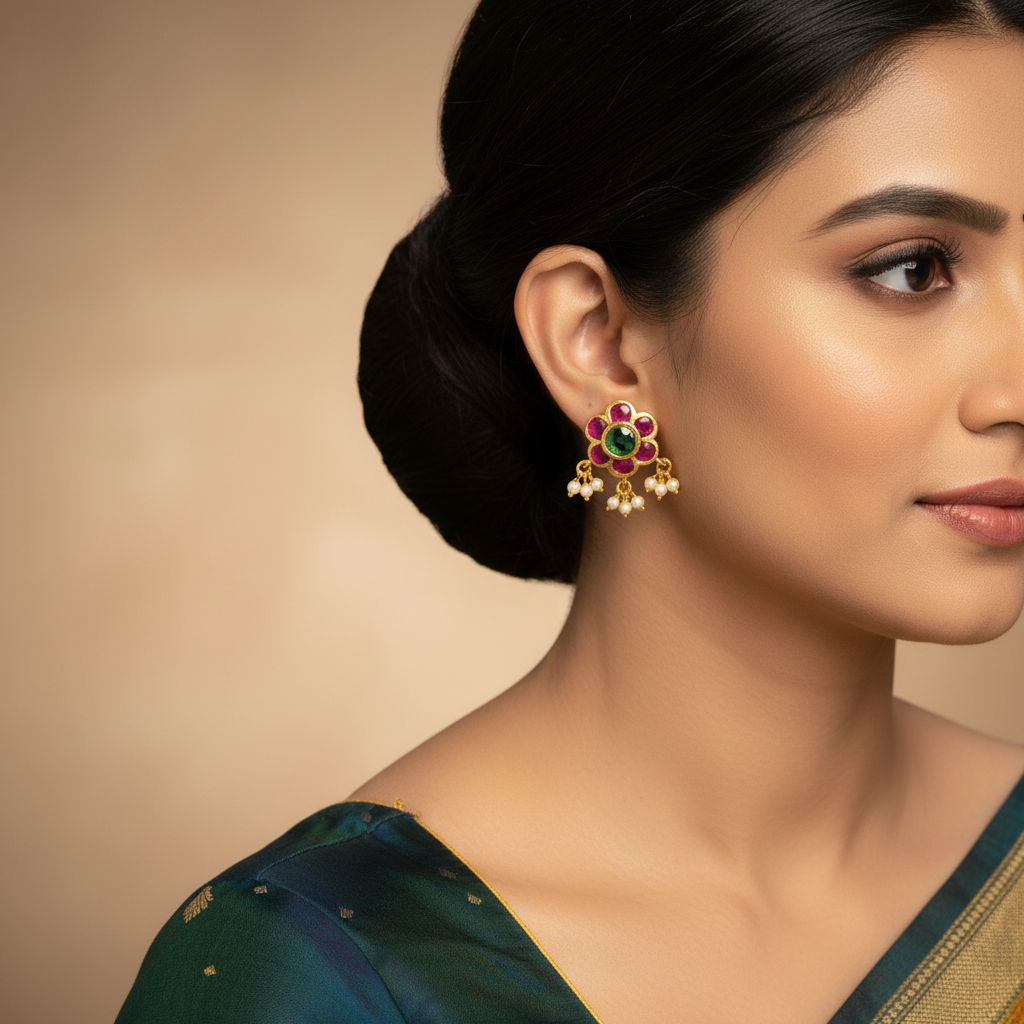 Inspired by the grandeur of South Indian temple jewellery, these Kempu Flower Studs are a masterpiece of traditional craftsmanship. A bold, luminous green Kemp stone sits at the heart of each earring, encircled by rich ruby-red and pink Kemp stones in a full floral bloom â all set in a gleaming 24K gold-plated base. Delicate pearl drops cascade below, adding a graceful finishing touch that moves beautifully with every step. Perfect for the bride, the festive dresser, or anyone who wears tradition with pride.