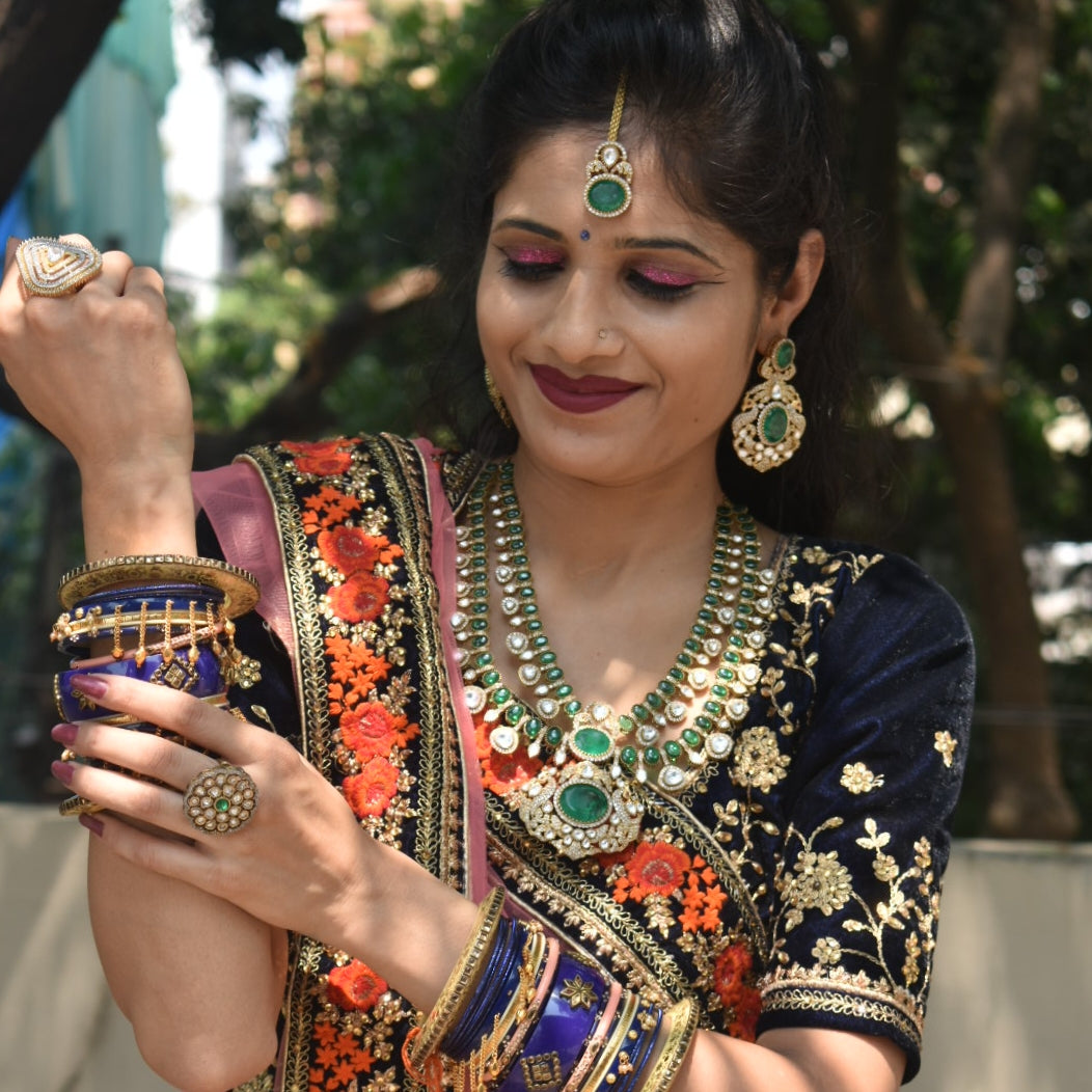 Moissanite Kundan Necklace Set - 24K Gold Emerald Maang Teeka Wedding Jewelry