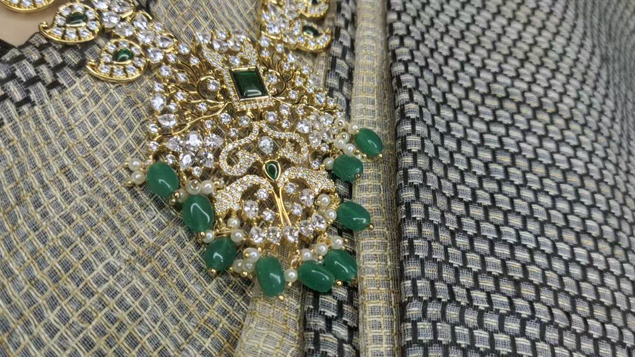ย Real diamond look grand bridal set. 1gram Gold metal pretty peacock design medium size necklace with Moissanite stones and dark green semi precious emeralds.pearls and emerald beads hanging all over the Pendent and paired up with matching heavy earrings with pearls and jade drops.