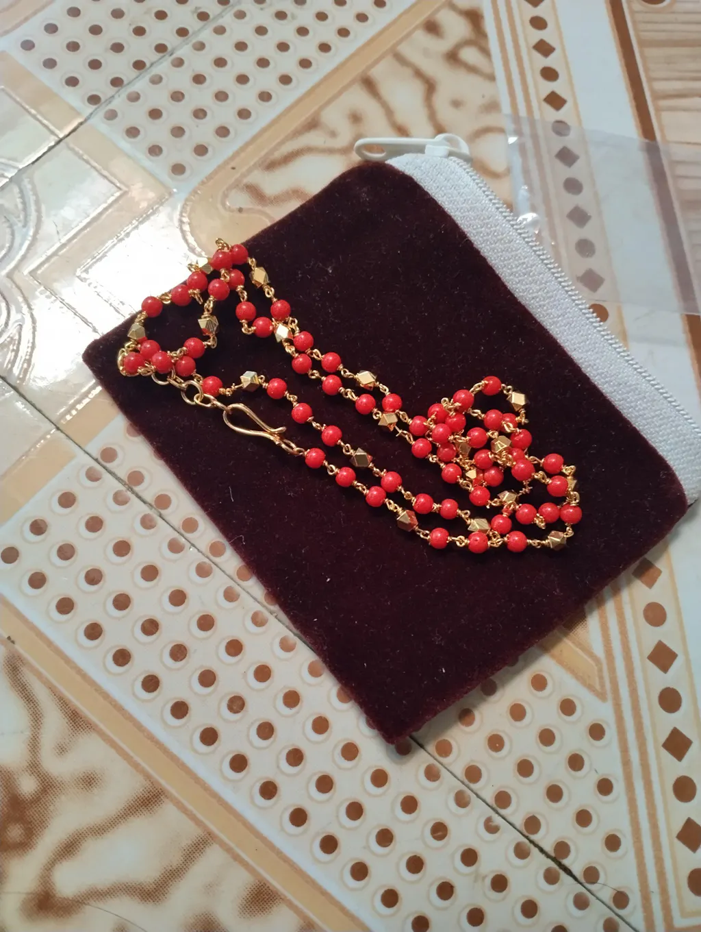 Coral Chain Binding With 24 Cut Gold Plated wire.The gold caps on the coral make it more Beautiful.It is very popular among elderly people.