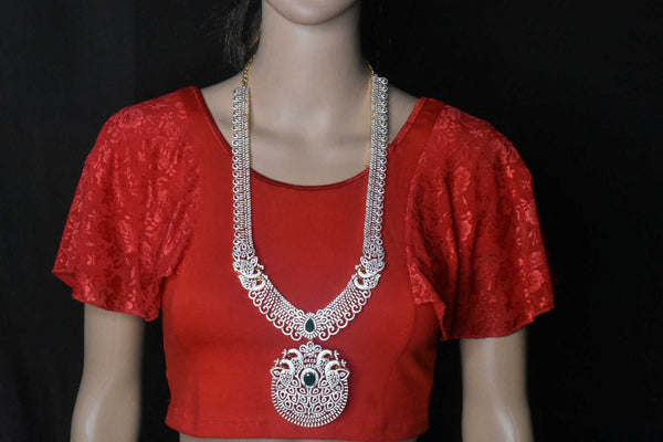 24 Carat gold plated peacock necklace adorned with American diamonds, emeralds and pearls paired with earrings