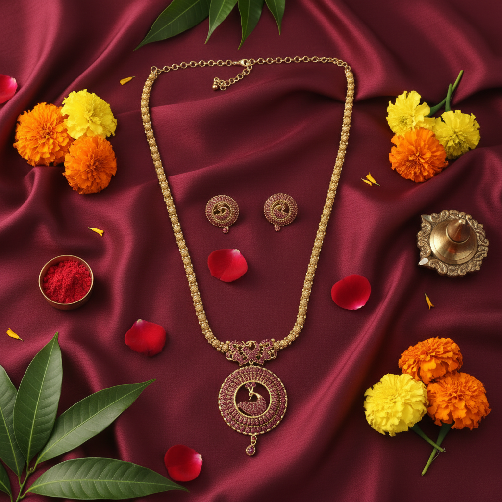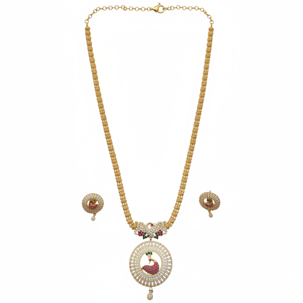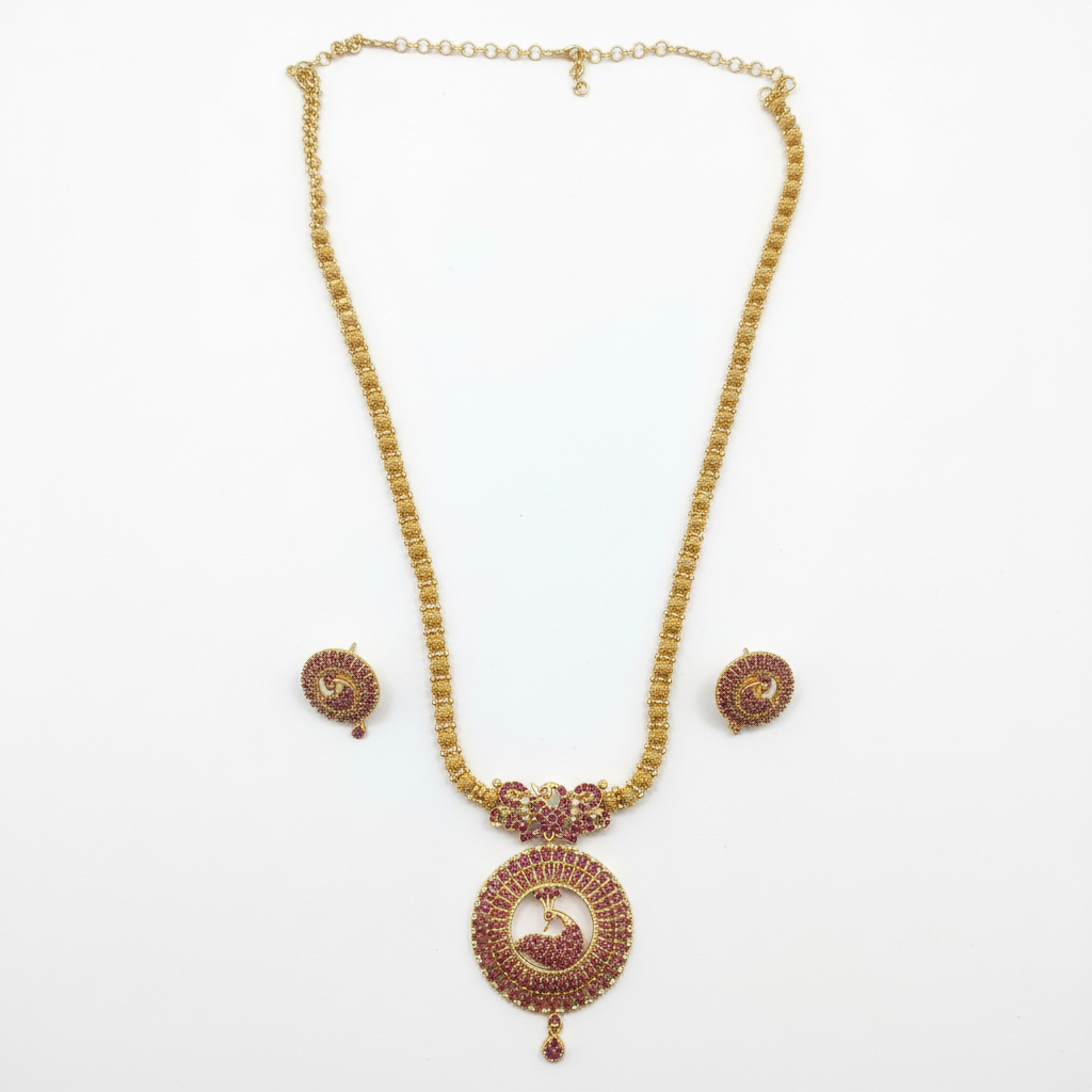 Adorn yourself in timeless elegance with our Peacock Long Haram Necklace Set โ a stunning tribute to classical Indian craftsmanship. Featuring a bold circular peacock pendant on a gold-plated long haram chain, paired with matching earrings.