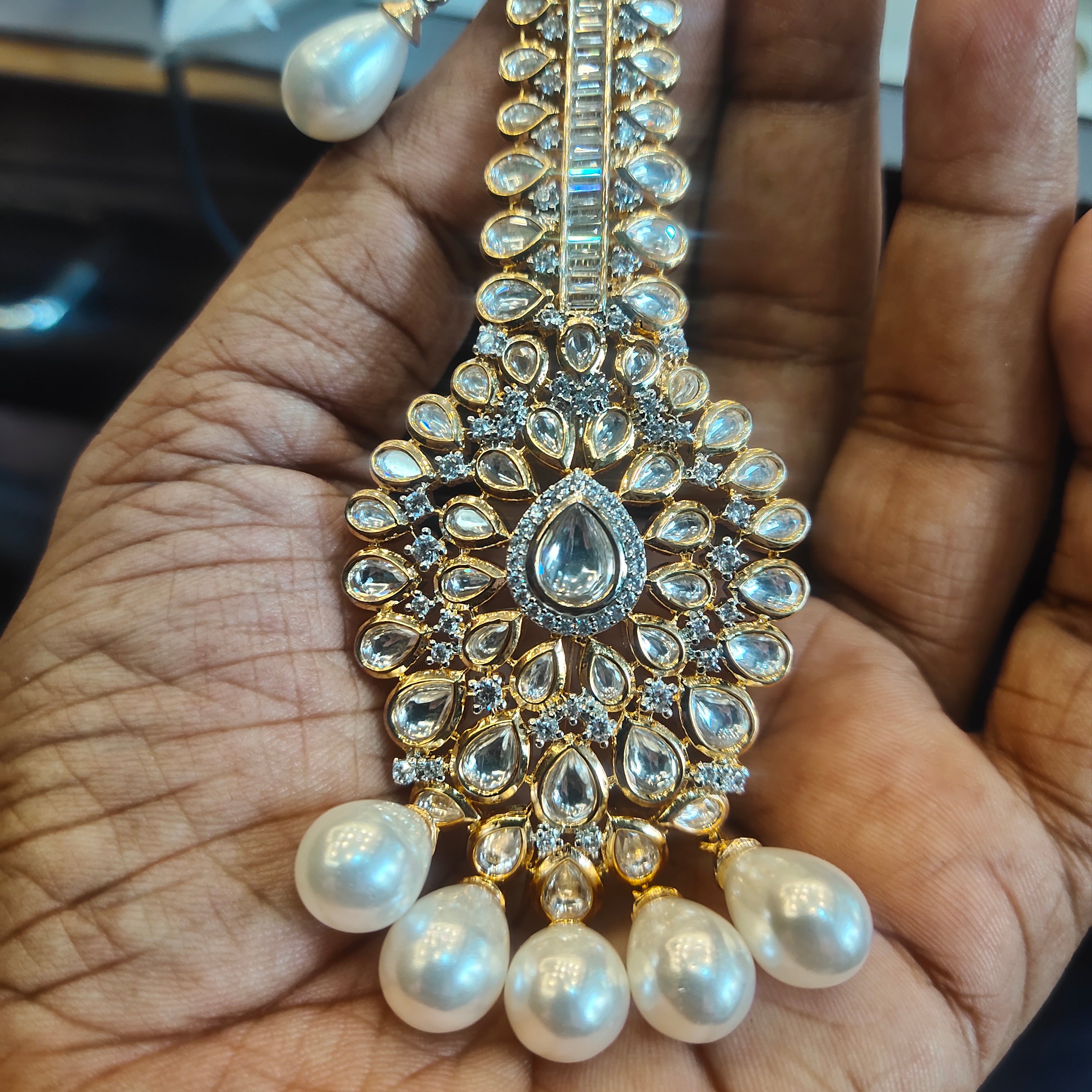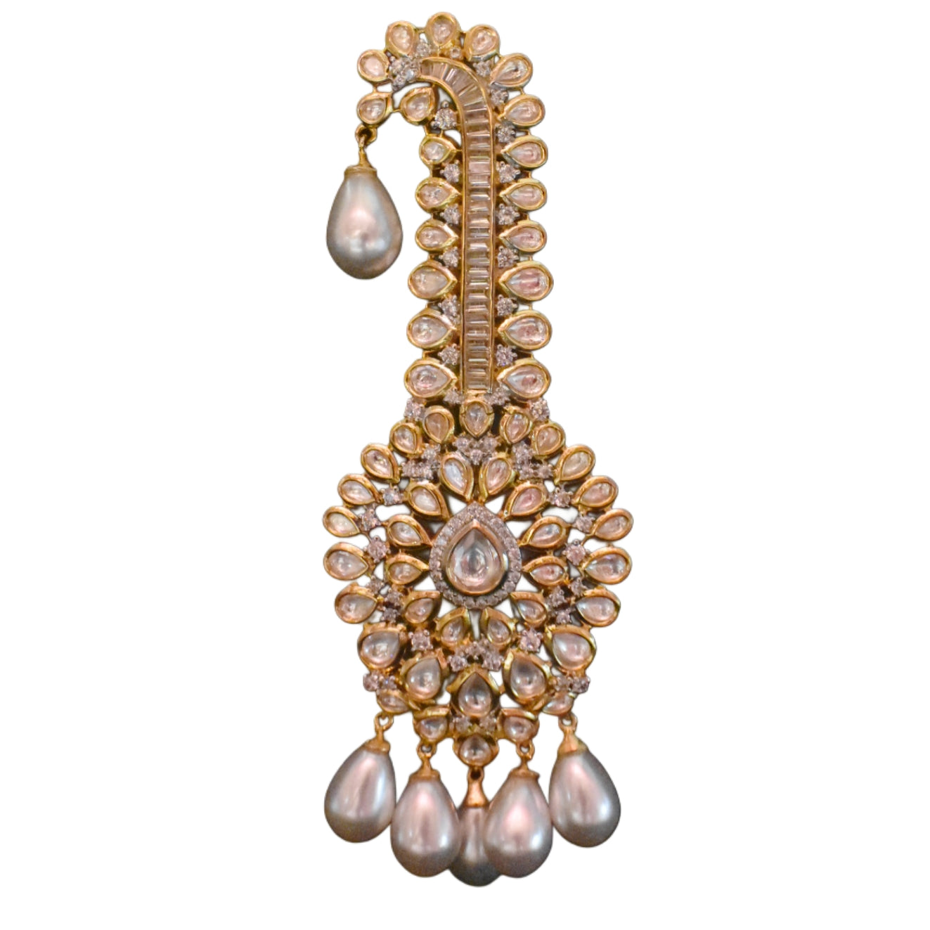This kalangi is the perfect finishing touch for the groom's turban, adding royal elegance and traditional charm to your special day. The combination of gold plating, kundan stones, and pearl accents creates a timeless piece that complements traditional wedding attire beautifully.