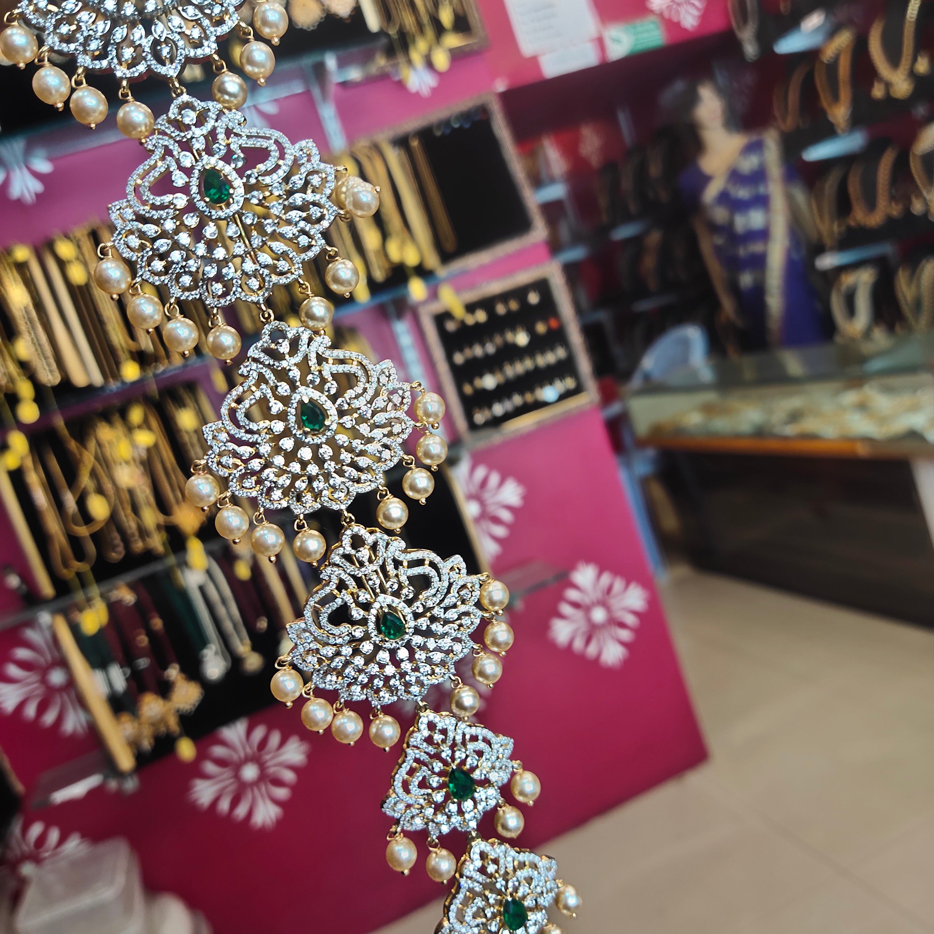 Transform your bridal look with this exquisite rhodium-gold plated zircon jada. This traditional hair jewelry piece adds the perfect touch of elegance and cultural authenticity to your special day hairstyle.