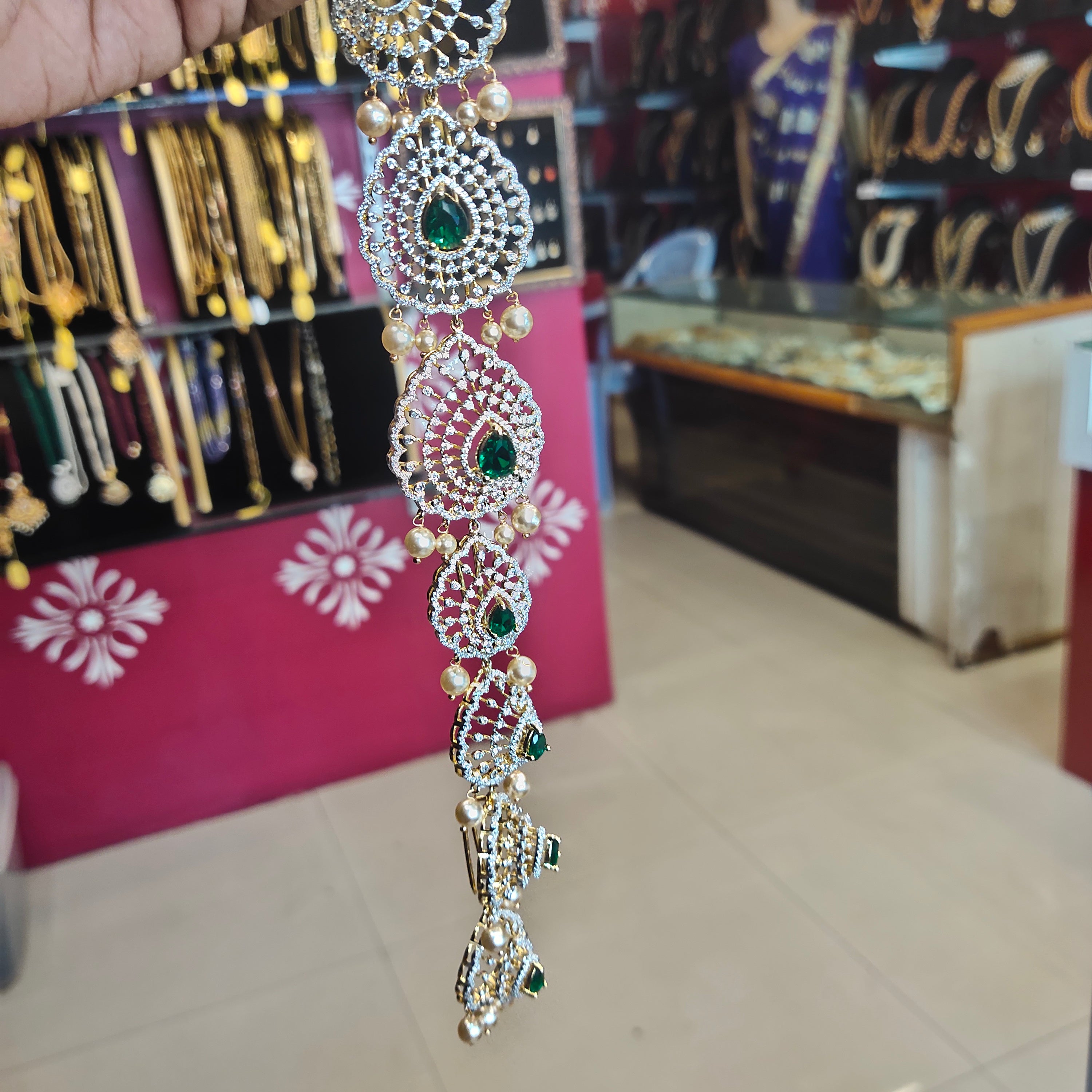 Make your wedding day unforgettable with this premium rhodium-gold plated zircon jada - a masterpiece of traditional Indian hair jewelry. Featuring brilliant cubic zirconia stones that rival real diamonds, this elegant hair accessory adds royal sophistication to your bridal look.
