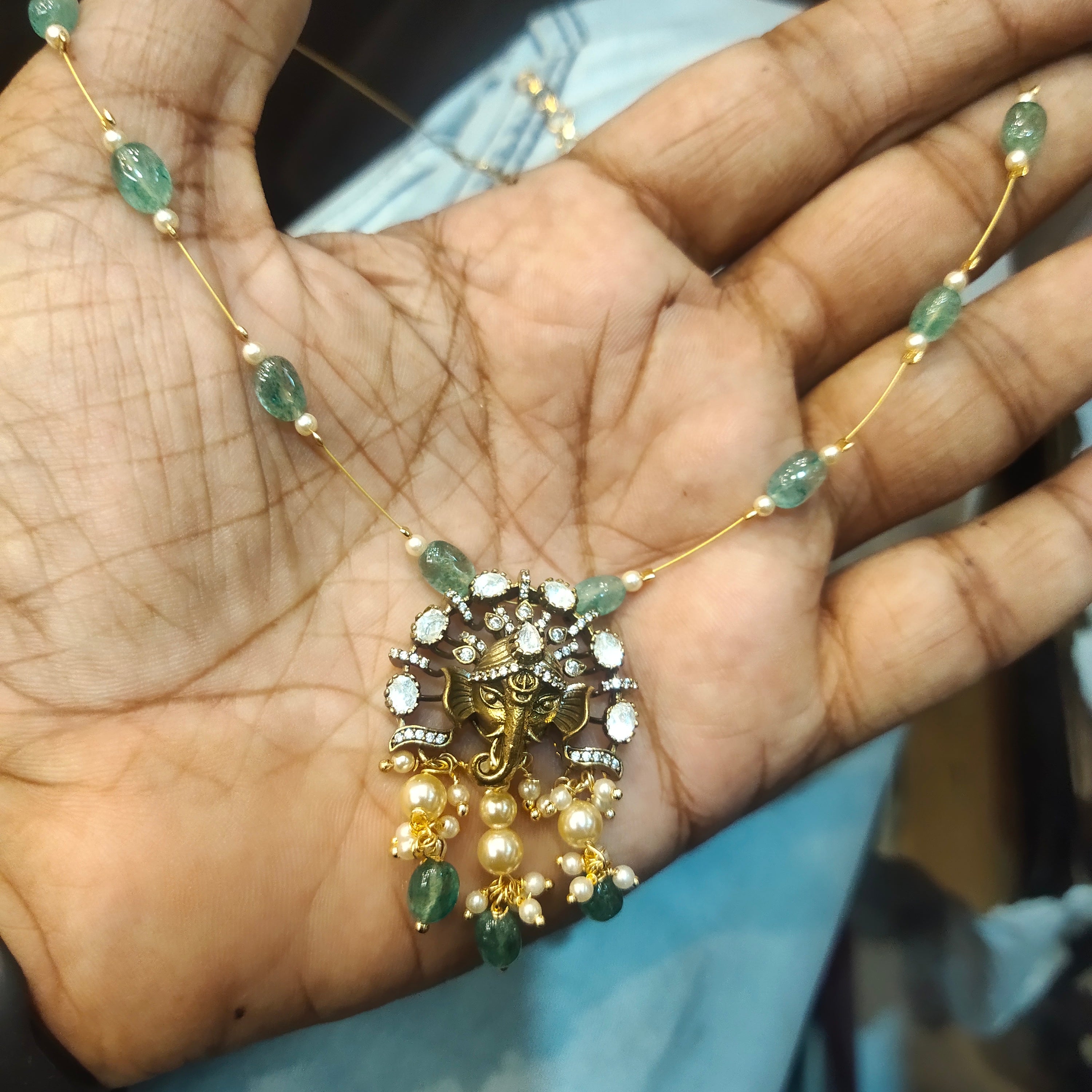 Embrace divine elegance with this exquisite Victorian finish zircon Lord Ganesha Invisible Necklace Set. This stunning piece features intricate Lord Ganesha detailing adorned with sparkling zircons, crafted in a beautiful Victorian finish that adds timeless charm to any occasion.